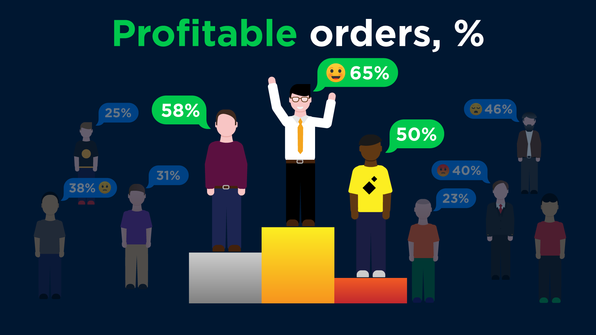 Remember the formula for profit that we introduced in the lesson ‘How to avoid paying extra to a broker’. We’ll now take a closer look at its core section. You can increase your profit by either increasing the percentage of your profitable orders or managing your average profit and average loss.